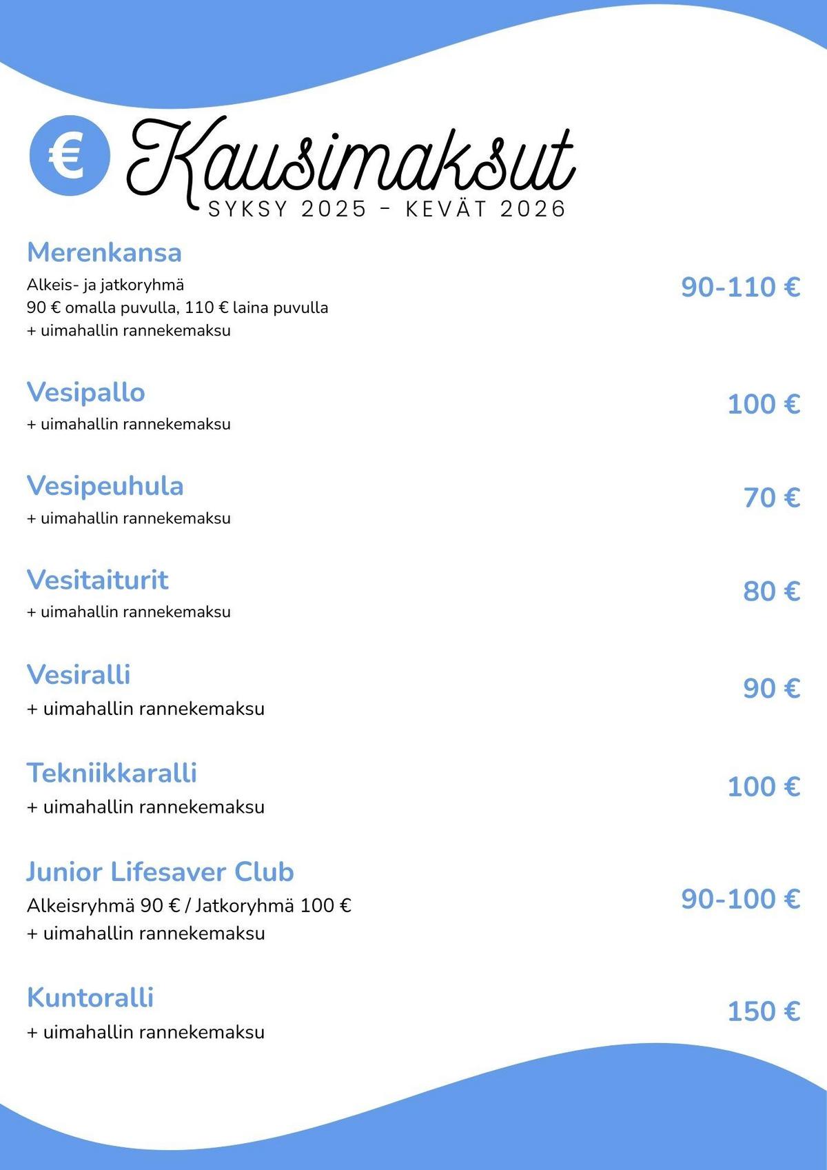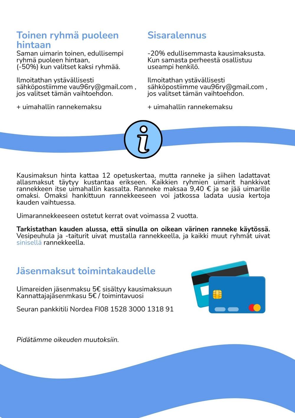 Rannekkeelle voi ladata uimakertoja myös netissälataa uimakertoja täältäAjantasaisen hinnaston rannekkeista löydät netistä katso ajantasainen hinnasto täältä